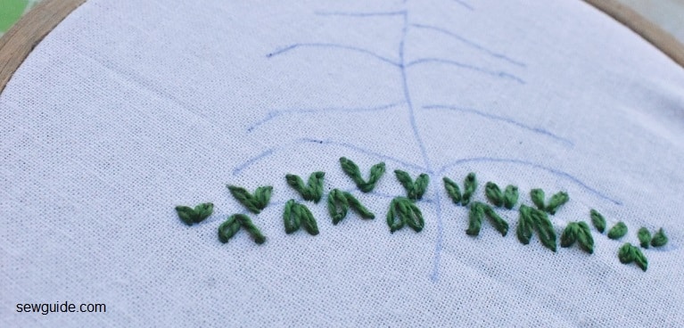 My favourite method of embroidering the christmas tree is the ever versatile lazy daisy stitch. Just use detached lazy daisy stitches in pairs in a v shape along the tree branches as in the picture below.