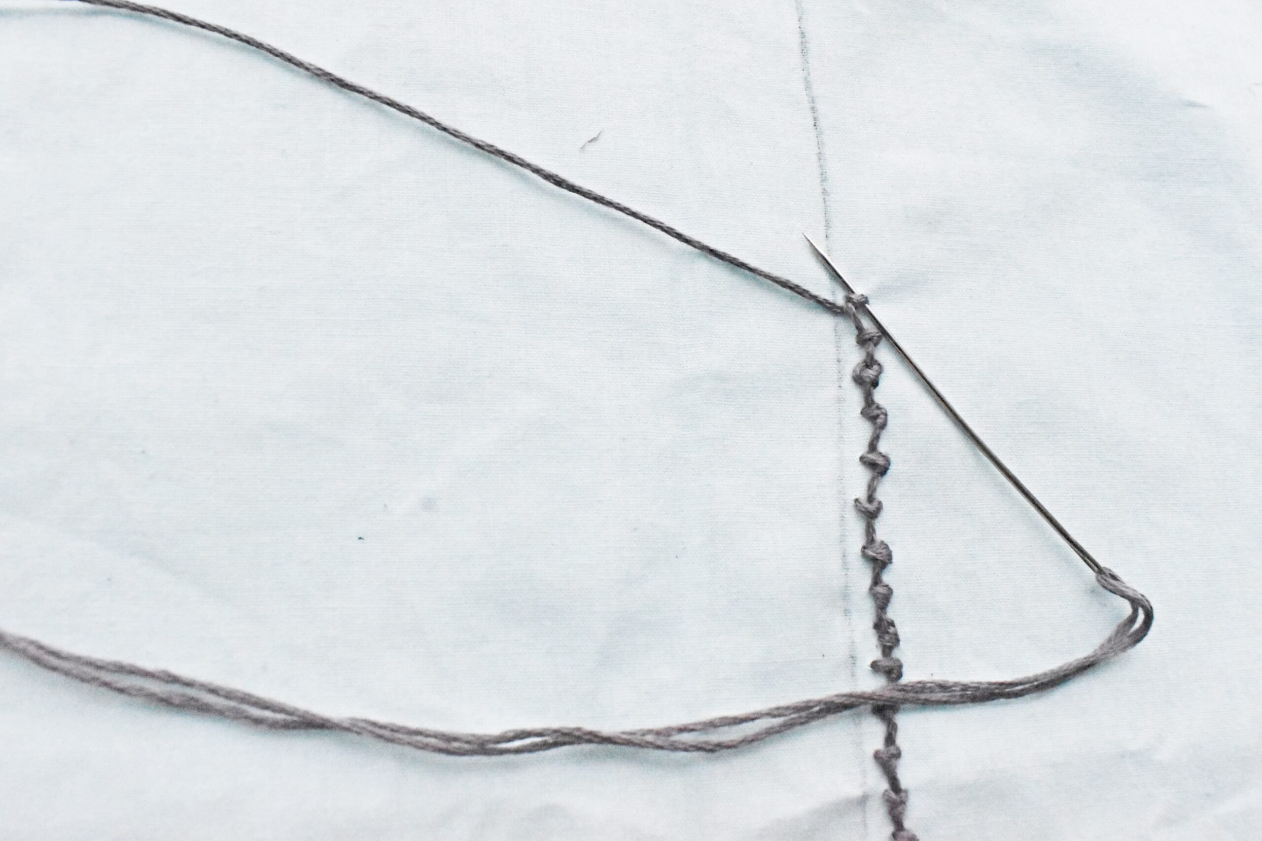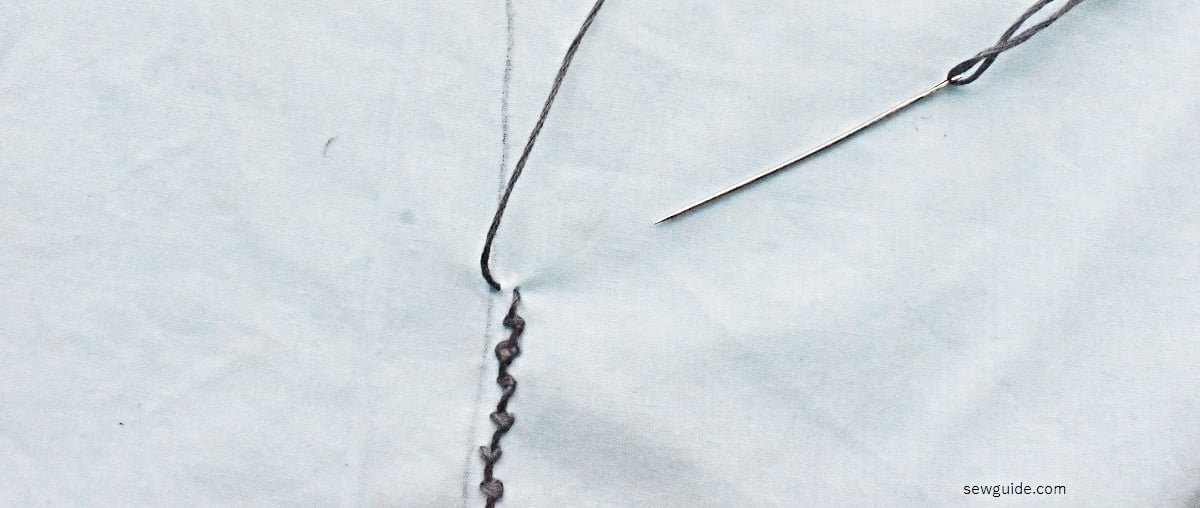 Start by coming up from the back of the fabric and take a very small stitch 1/4 inch from where you came up.
