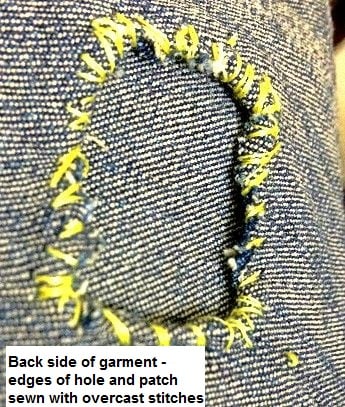 Turn the garment wrong side out. The edge of the hole and the fabric patch piece will be together. Make overcast stitch all over the edge.