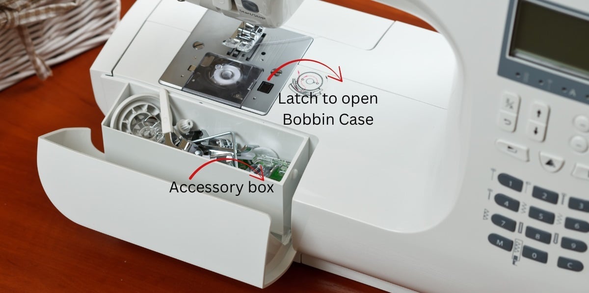 The accessory box is located around the free arm under the needle, attached to your sewing machine. It is a storage for your sewing accessories like feet, bobbins, etc., and serves an extended table for your fabric to rest when sewing.