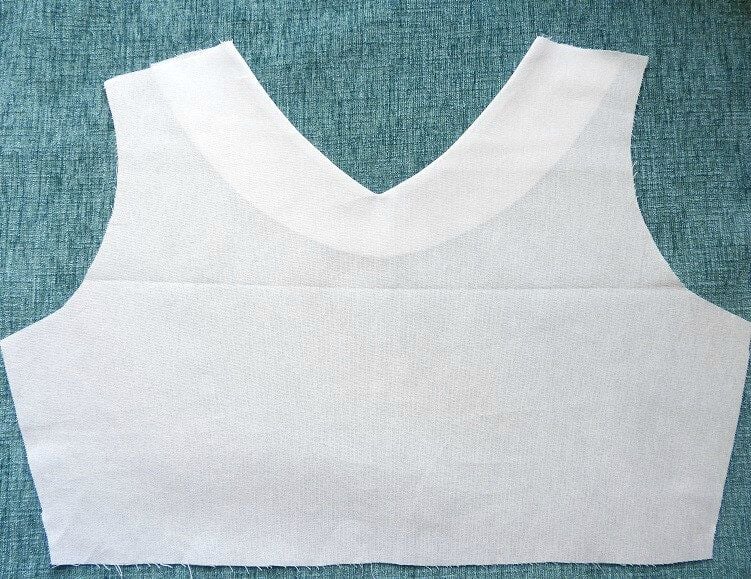 To sew this you have to cut a facing for the v-neck;You can mark the neckline on the facing and then place it on the bodice. Place it on the front bodice and then sew in place, both rightsides together. Checkout the post on facings for more details on this.