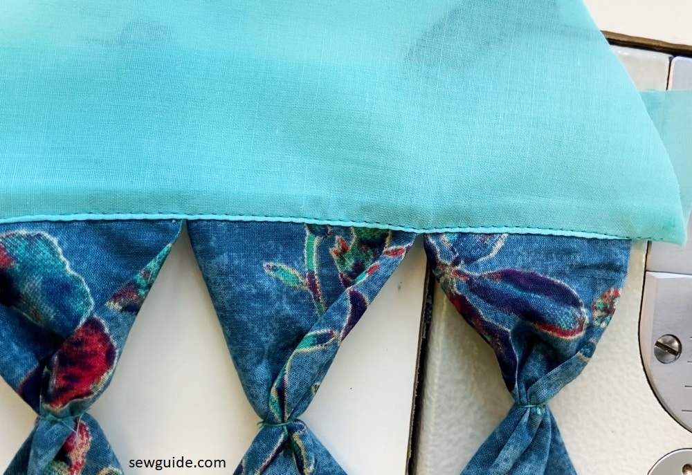 Cut out a 4 inch wide fabric piece , 12 plus inches long (Length of the fabric would depend on the length of your sleeve and how many bows you need to insert). Fold it by the middle and sew the long edges together (rightsides to the inside). Turn this tube rightsides outside.
