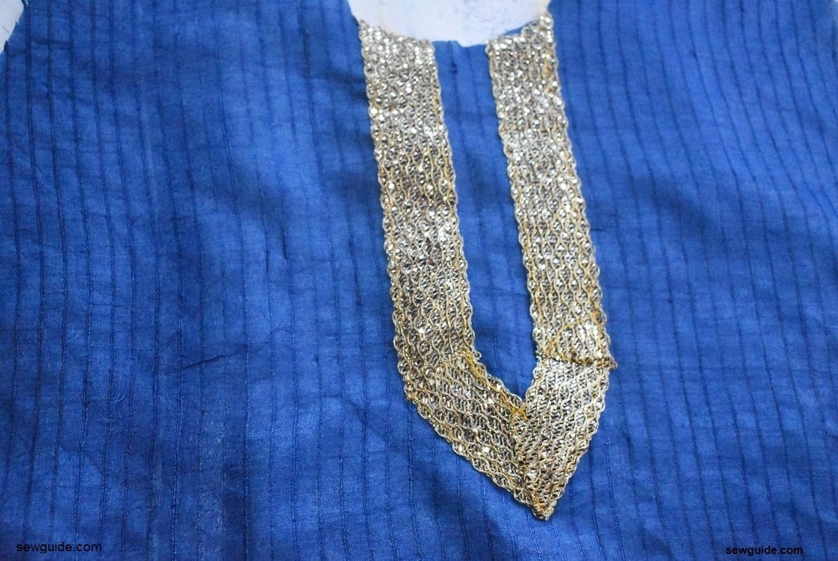 Cut a simple round shape on the tunic bodice fabric. This neckline design suits a round neckline.