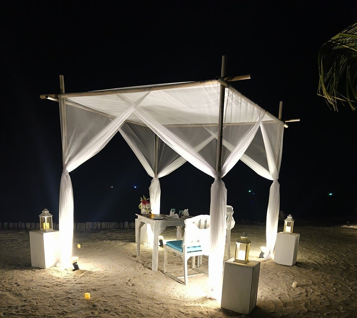 A light summer dress (maxi dress) is ideal for dining out. During our stay, my husband arranged a cozy dinner for just the two of us, in a specially decorated tent facing the sea.