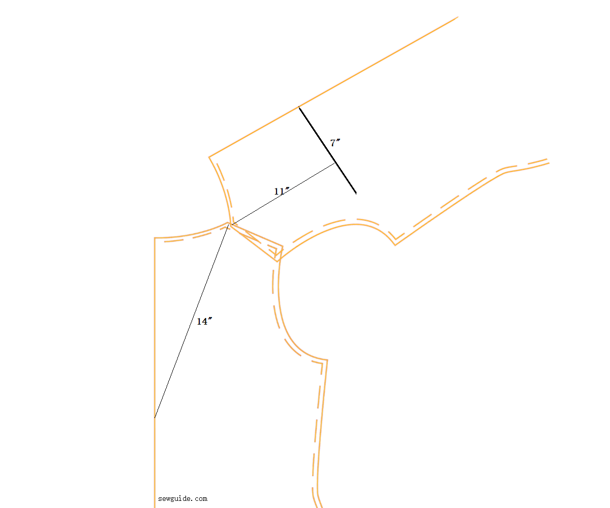 Mark 11 inches down from the shoulder point on the back to make the bib on the back. Mark this 7 inches wide from the side. On the front side mark 14 inch from the shoulder point in a slanting line.