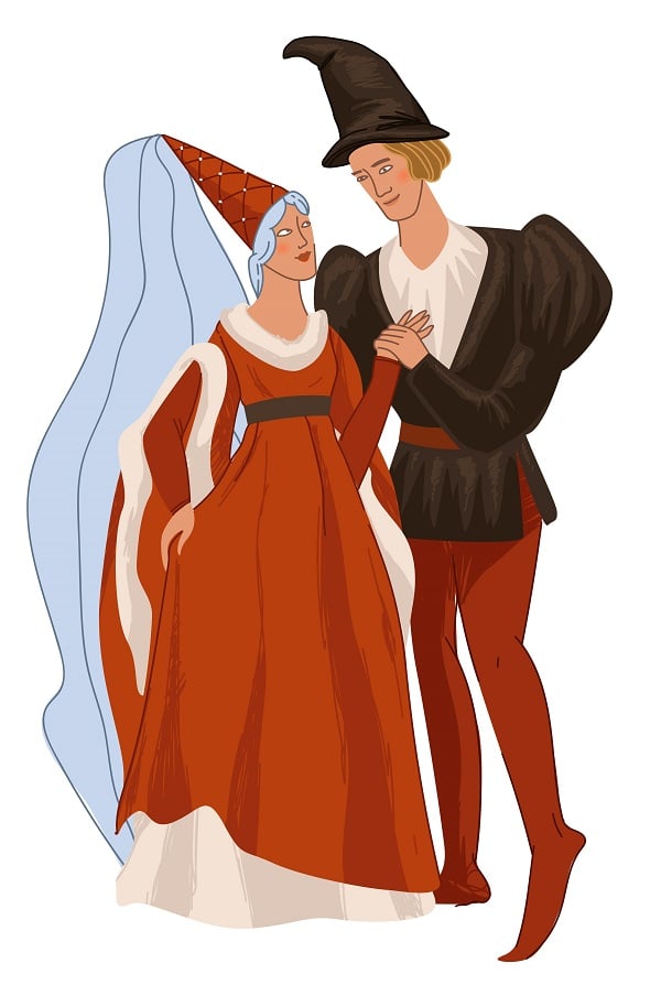 Another outer garment of this era was called cotehardie. It was a tight-fitting knee-length garment buttoned or laced down to the waist level at the front. Down the waist, it flared into a skirt with the middle part open. The sleeves of the cotehardie were complex and decorated. A belt was worn with cotehardie.