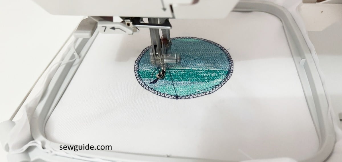 Place the hoop back on the machine. The final stitching will be a satin stitch that goes around the entire design, neatly finishing the edges and securing the patch to the plastic sheeting.