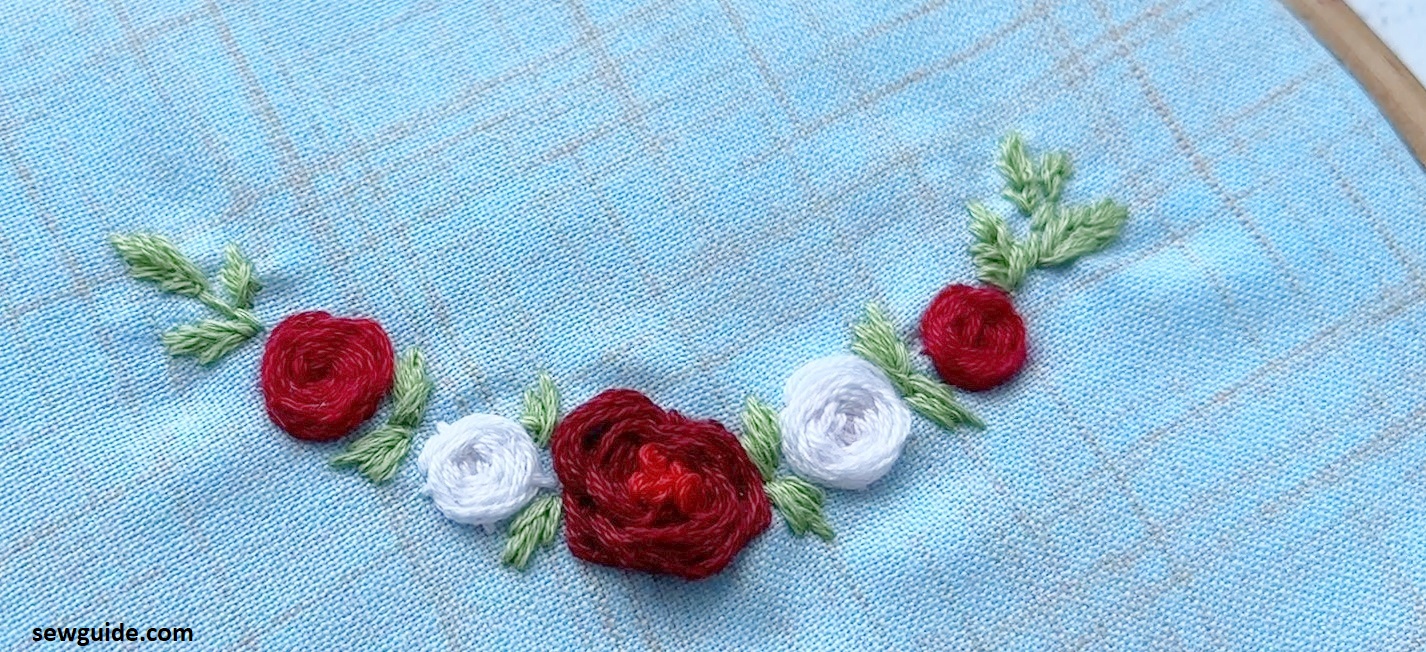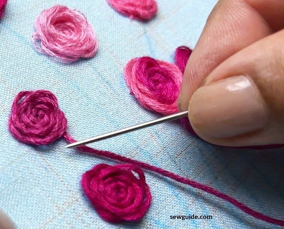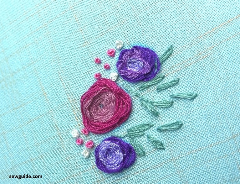 Infact, just like texture, the number of thread you use to make them can also change the look of your roses. This is a rose being done with two strands of embroidery floss.