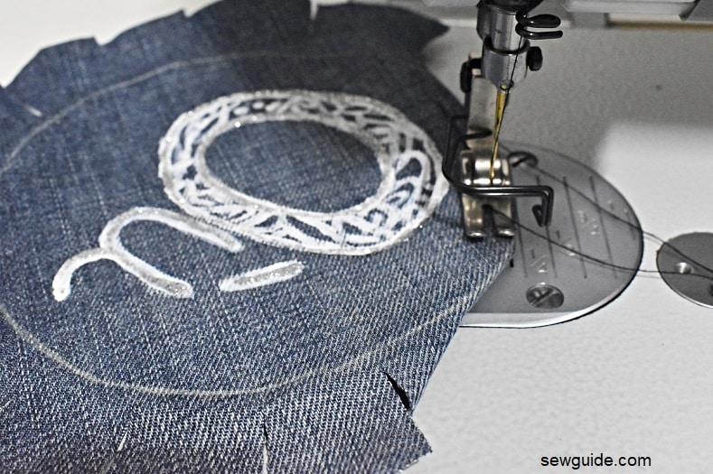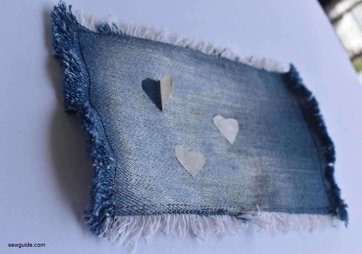 Cut out denim fabric scrap piece from your old jeans. Sew 1/4 or 1/2 inch from the outer edge, all along the edge.