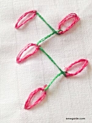 One way to do this chain stitch variation is to start by making the detached chain stitches and connecting them with straight stitches. This way, you can make stitches in two different colors.