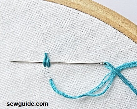 Put the needle back in the same hole it just came through; bring it up a small distance above it. Keep the thread under the needle when bringing up so that a loop is formed.