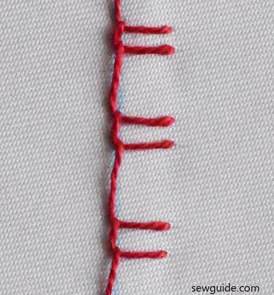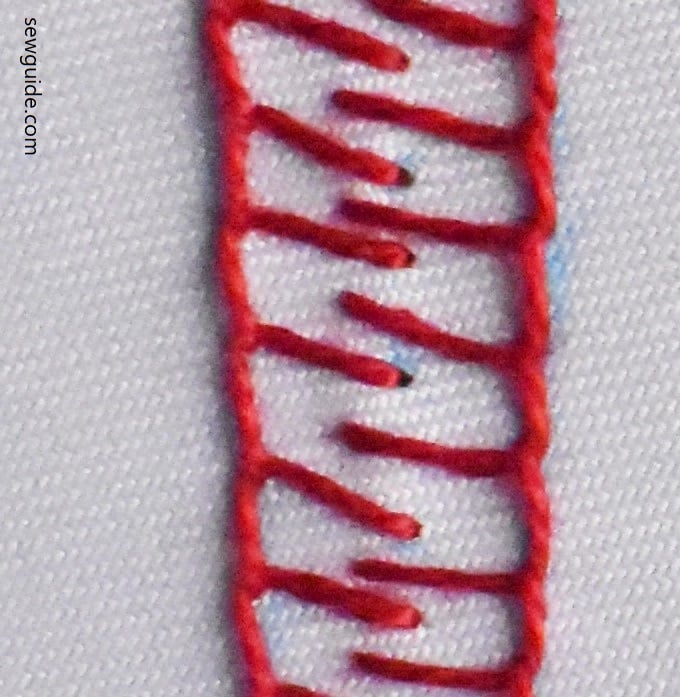 In this stitch, another parallel row of blanket stitch is worked, such that the teeth of one row of stitches come between the other row. This looks more attractive when done with a different colored thread.