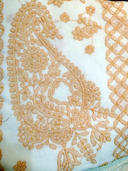 Chikankari is very similar to the Shadow work, a white embroidery work which uses herringbone stitches on the back of the fabric to fill designs, resulting in a fine shadow on the face of the fabric.