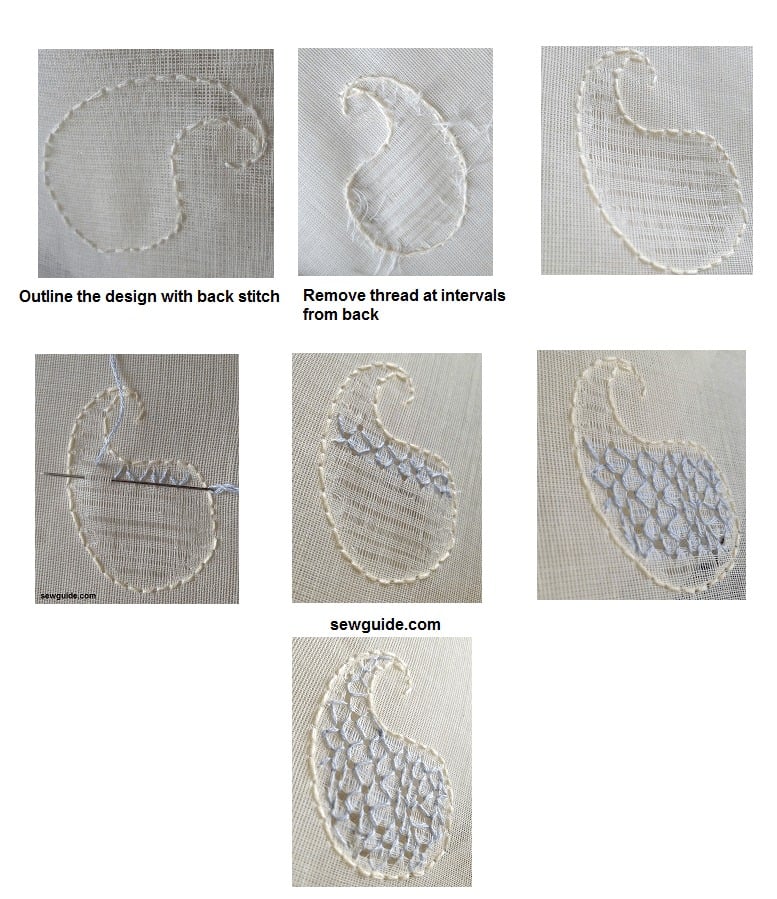 The picture below is from the drawn threadwork tutorial. I suppose on the thin fabric used (organdy, mull etc) to make the chikankari work there is no need to draw the threads out. When done without the thread drawn out it is called pulled thread work.