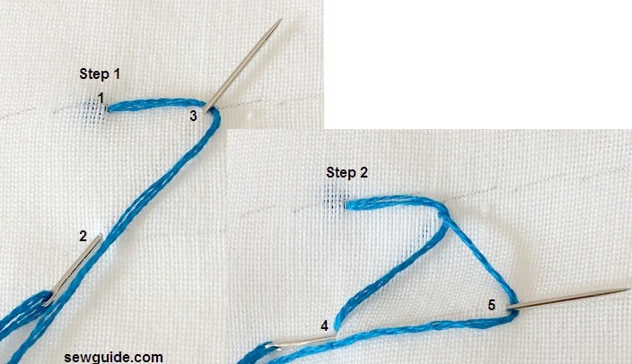 Take down the needle at 2 opposite to the point 1, on the 3rd line and without pulling the needle fully bring up the needle at 3 , a little up on the 2nd line. Ensure that loop is above when you pull the needle .