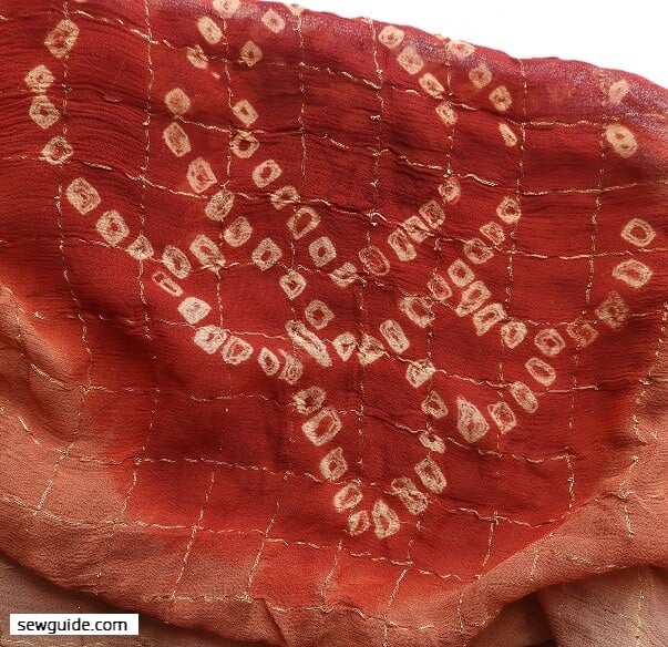 Small dots are made on the fabric by tying fabric with thread into a point at regular intervals. These diamond shaped patterns can be made in a random pattern or in a way resulting in them forming a motif.