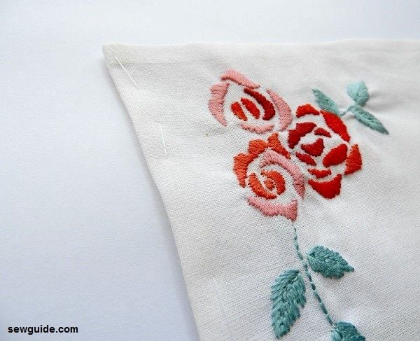 If you are adding embroidery along the corner, leave some extra fabric along edges so that you can comfortably fit the fabric on a hoop – the embroidery is usually placed 2 inch from the corner.( After the embroidery is done cut out the extra)