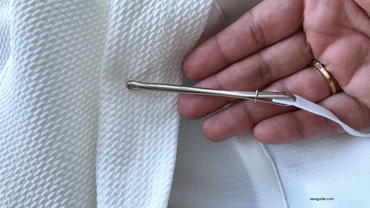 Now using a bodkin or something (I don’t know anything else since I discovered bodkins– Pins, what !!) thread the elastic through the casing