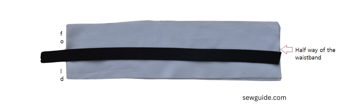 Step 2. Keep the elastic on top, just under the half way mark of the fabric width. The red arrow points to the half way mark of the waistband. Keep the elastic straight just under this mark.