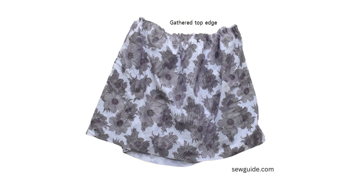 Gather the top of the skirt – make two rows of gathering stitches 1/2 inches down from the top edge of the skirt tube. Leave thread tails at the start and the end. Gently pull the thread tails – this will gather the skirt’s top edge. Gather it to match the waistband, which is hip round plus 2 inches.