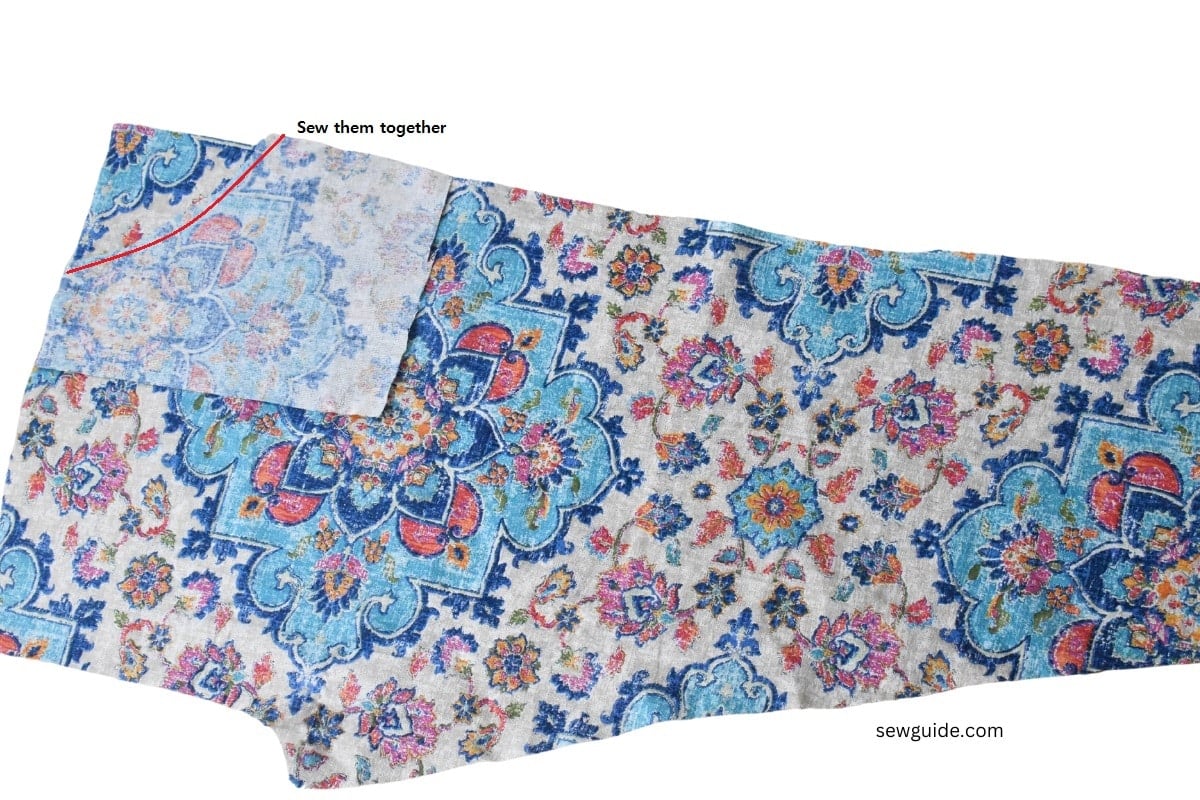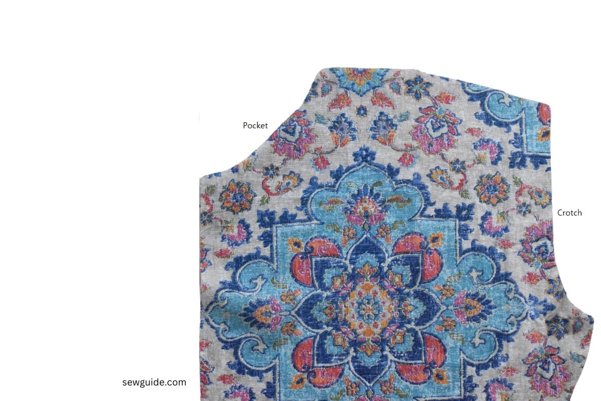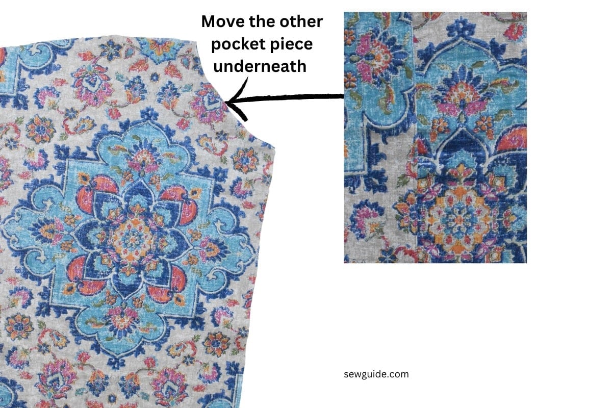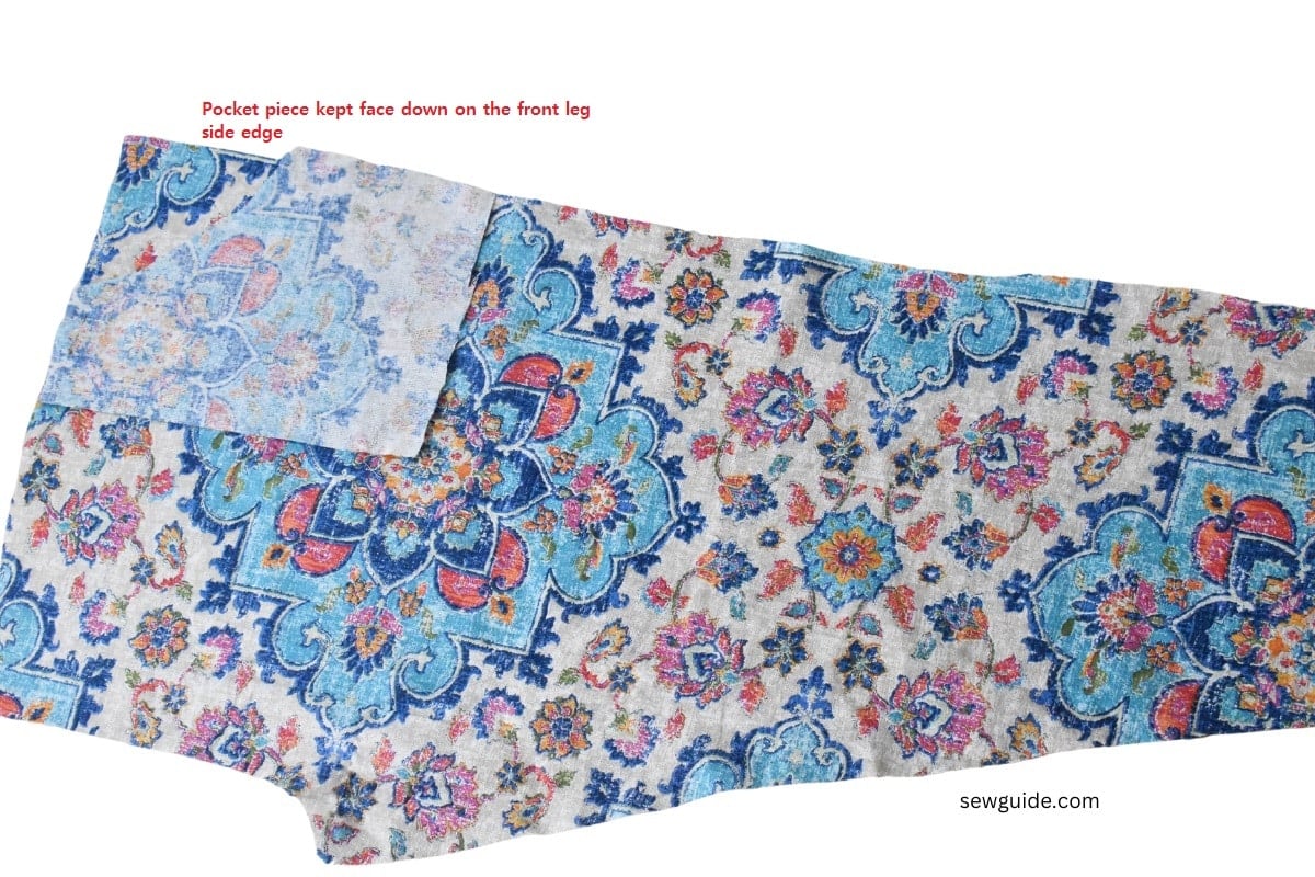 Keep the cut pocket piece face down on the front leg( ensure that the correct popcket piece is chosen – I mean, the right side and left side are different)