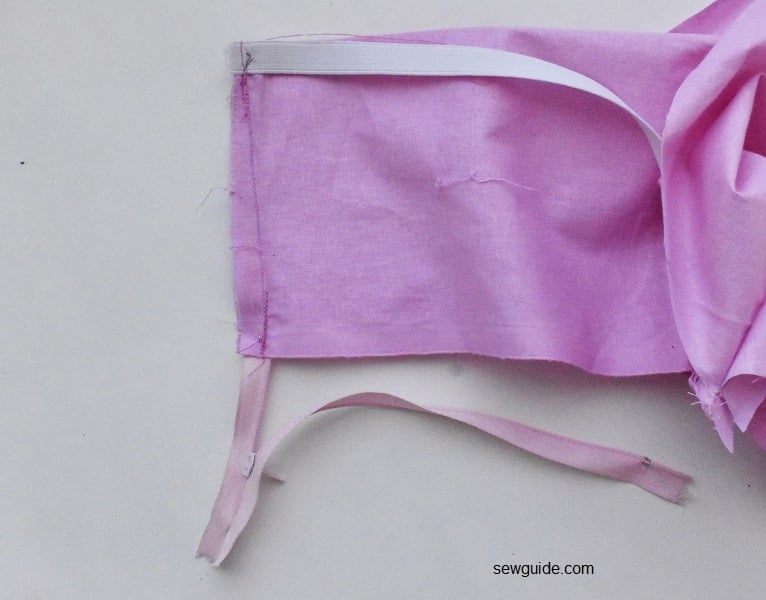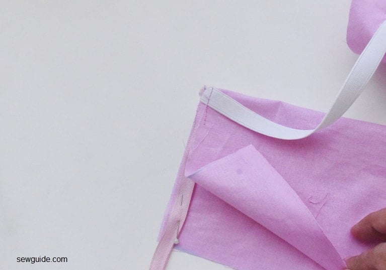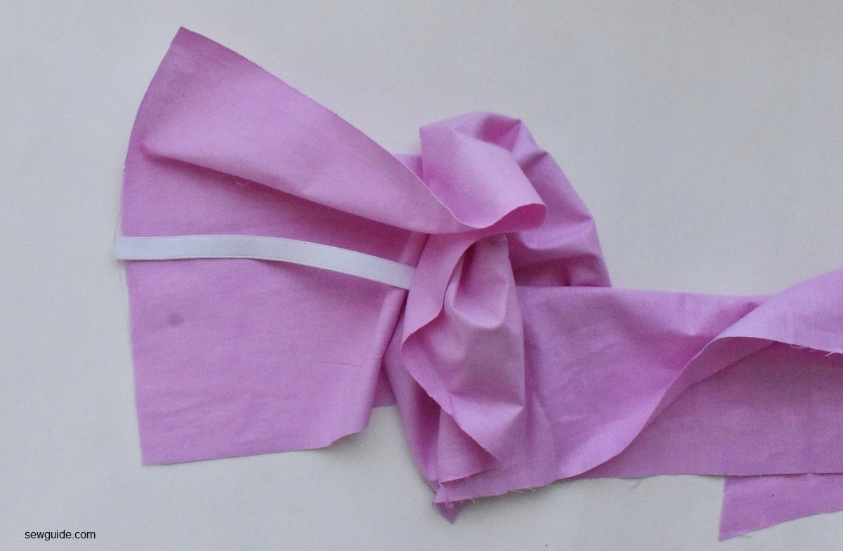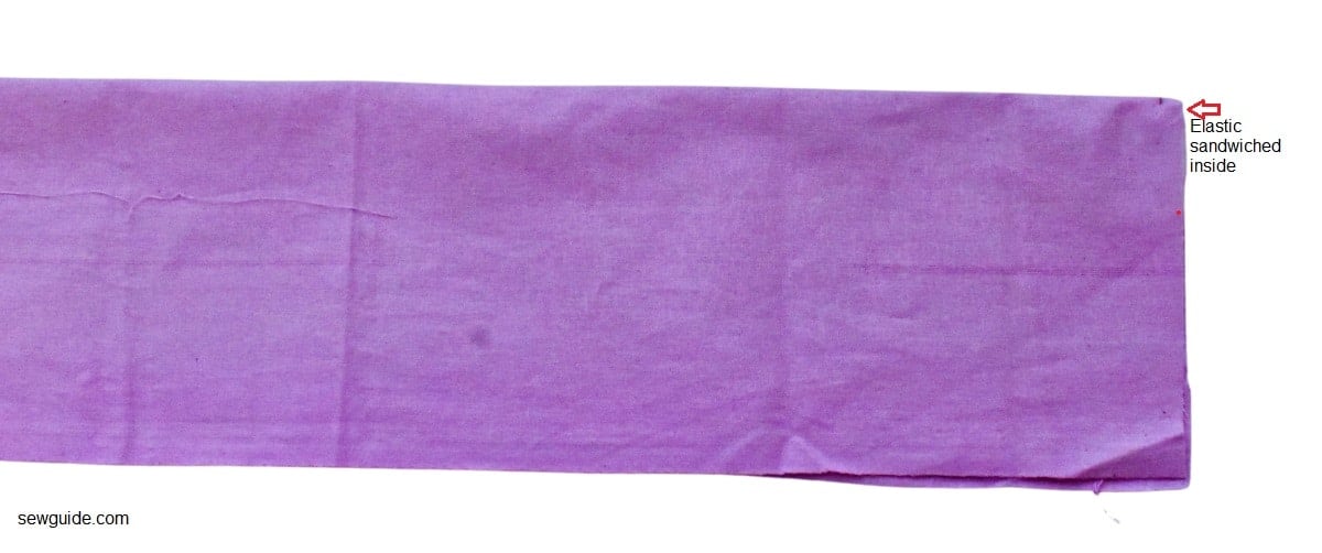 Sew under the elastic on the back waistband – effectively making a casing for the elastic. Just sew under the elastic- that is it. Just bring the gather up as you sew so that you do not make unnecessery puckers on the waistband.