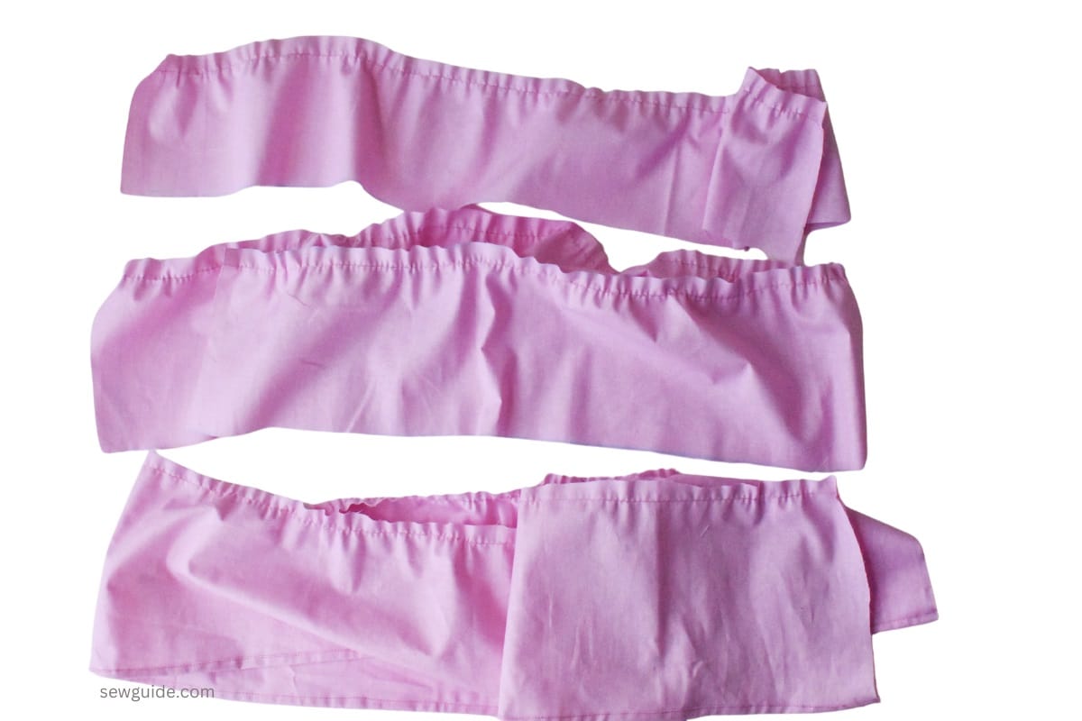 Make gathering stitches to make the frills on the tier fabrics. You can make a single stitch and gather but it would not look as good or gather as nice as it does when you make double rows of long stitches. Just my experience. (Though I have made a single stitch here 🙂 )