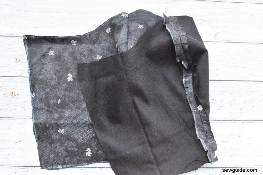 Now , you have to join the outer pieces of front bodice to lining. Keep the outer pieces of front bodice and lining of front bodice together. (right sides to the inside)