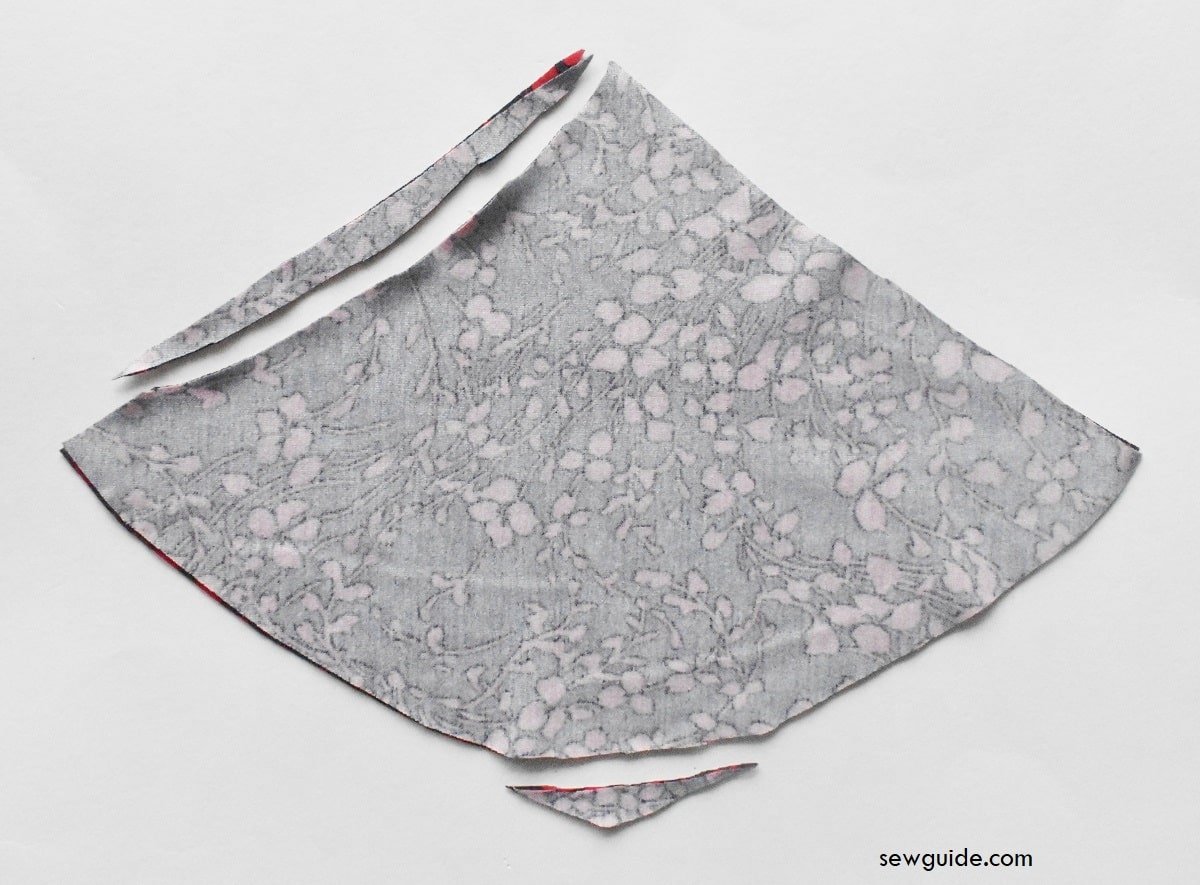 Keep the two triangle shaped fabric pieces together, right sides together. Shape one of the sides to the inside a little and the bottom edge to have a slight curve rather than the angle it has.