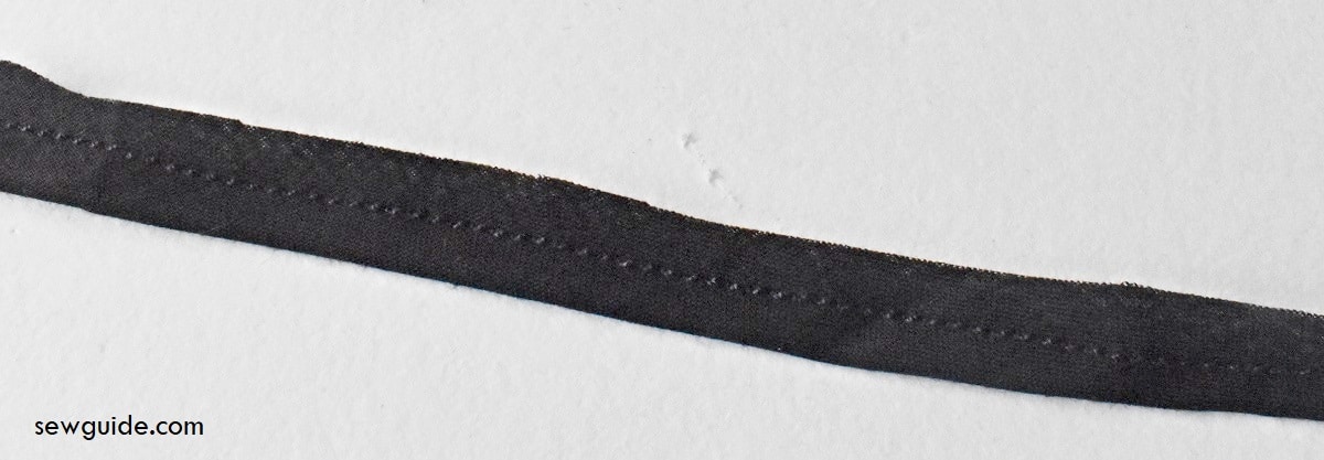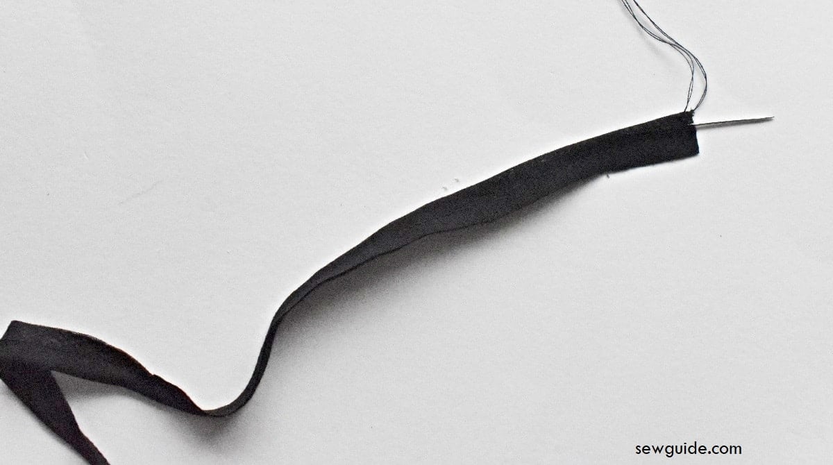 Fold the fabric strip by the middle. Sew down the middle of the folded fabric. Do not cut off the extra allowance – it should fill the inside of tube.