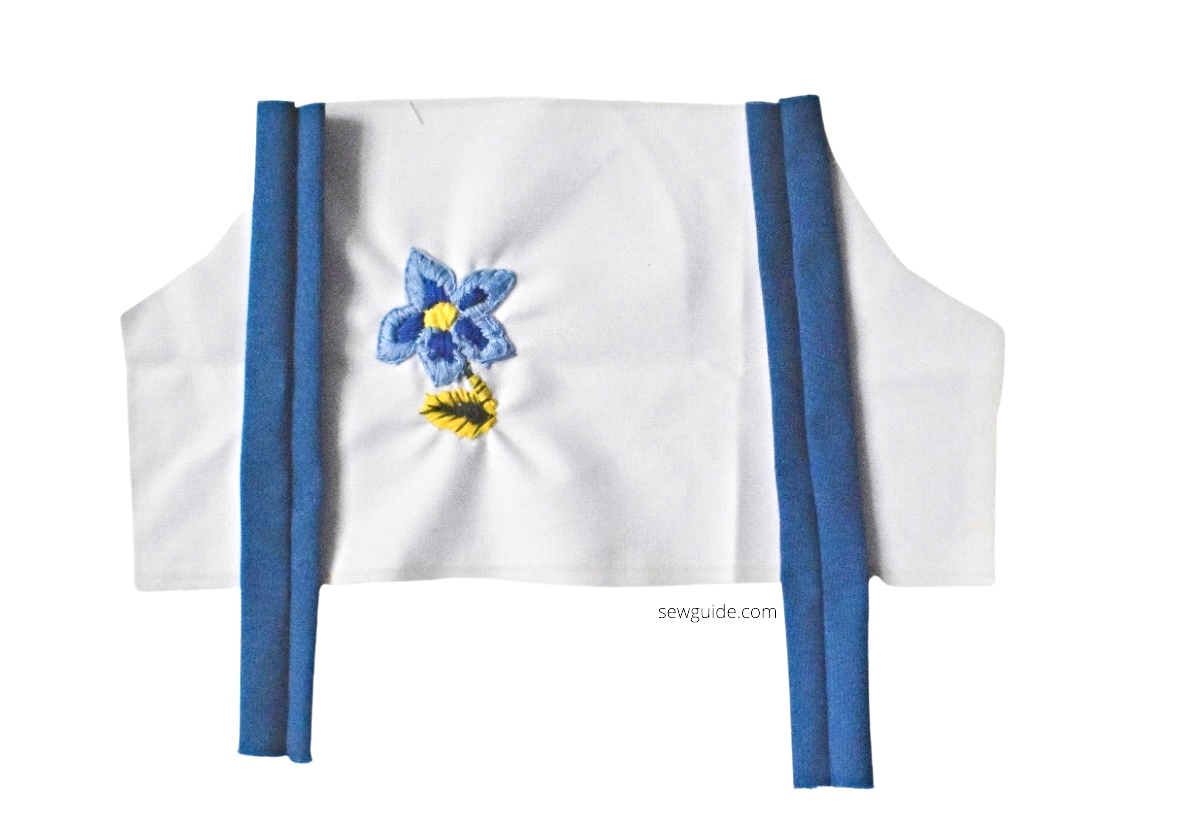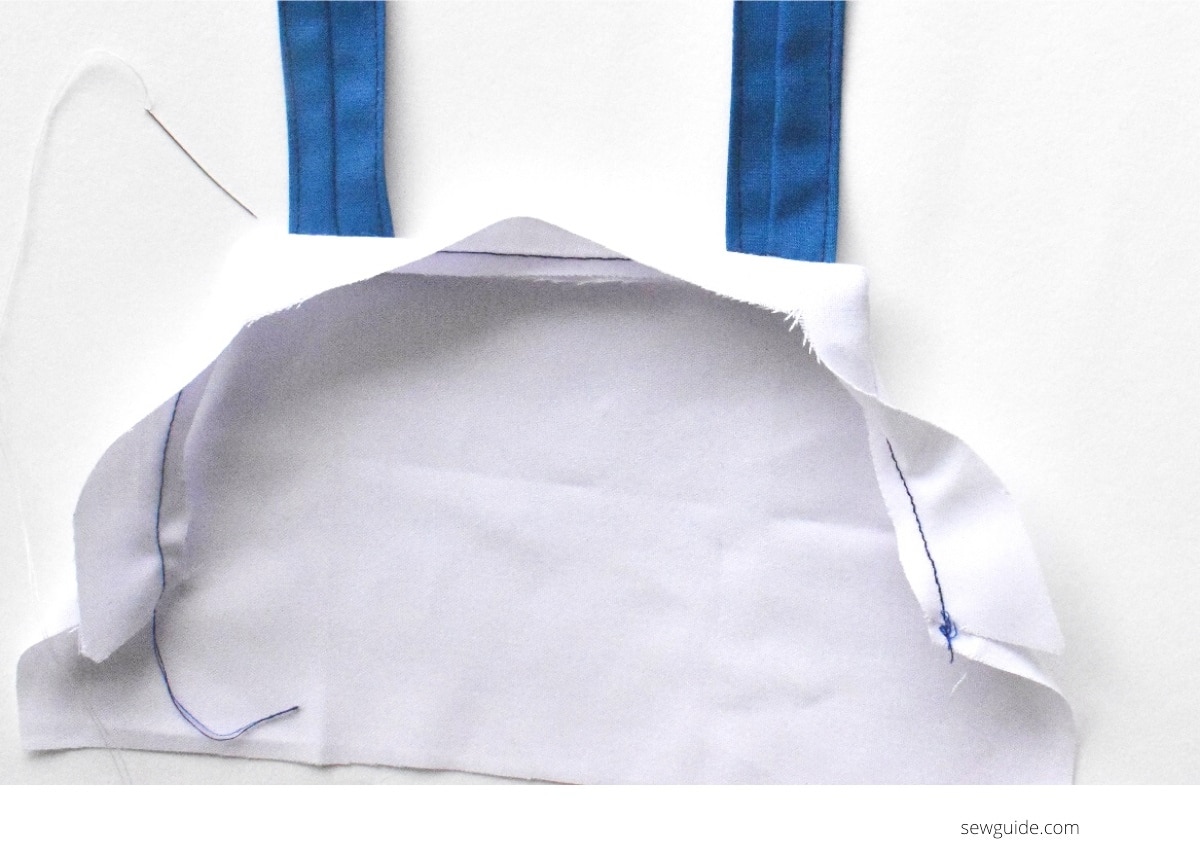 Keep the other end of the straps on top of the back bodice (right side up); keep the facing on top and sew in place. As in the picture above.