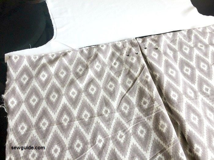 Make the inverted pleats in the front dress piece.Turn up the wrong side of the fabric . Keep the fabric folded by the center. From the center fold line, mark the correct center of the bodice. From there make pleats to either side of the center fold line, as shown in picture below. Pin in place. Baste stitch in place