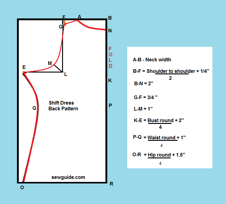 The pattern given below is for both the front and back of the dress – the difference between front and back is in the neck depth and the armhole. The front neckline and the front armhole is marked as red lines in the diagram