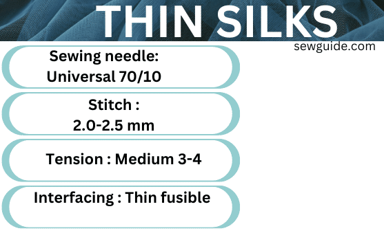 As for needles, use thin Microtex needles (Sharps) in size 60/8, 65/9 for thin silk; size 70/10 for medium weight silk. Microtex needles are Fine needles with a slim sharp point. You can use universal needles with medium weight silks.