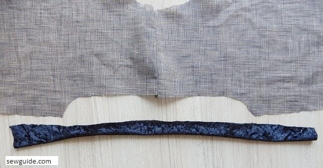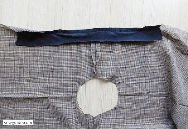 Keep a fabric piece of about 6 inches length and 4 inches wide (facing) and keep it on the center of the back bodice. Align the center of the two and pin in place.