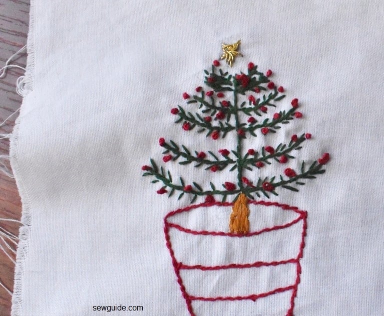 Fill in the branches and the tree trunk with stem stitches. Add small red french knots as ornaments.