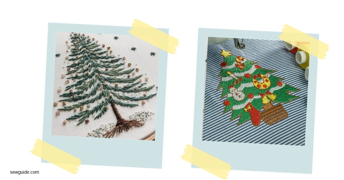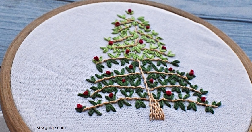Here are some simple embroidery designs for your Christmas-related project. You do not need a complex step-by-step guide to creating a basic Christmas tree embroidery project – it is as easy as making a geometric pattern or a simple scribbled drawing and the most basic embroidery stitches.
