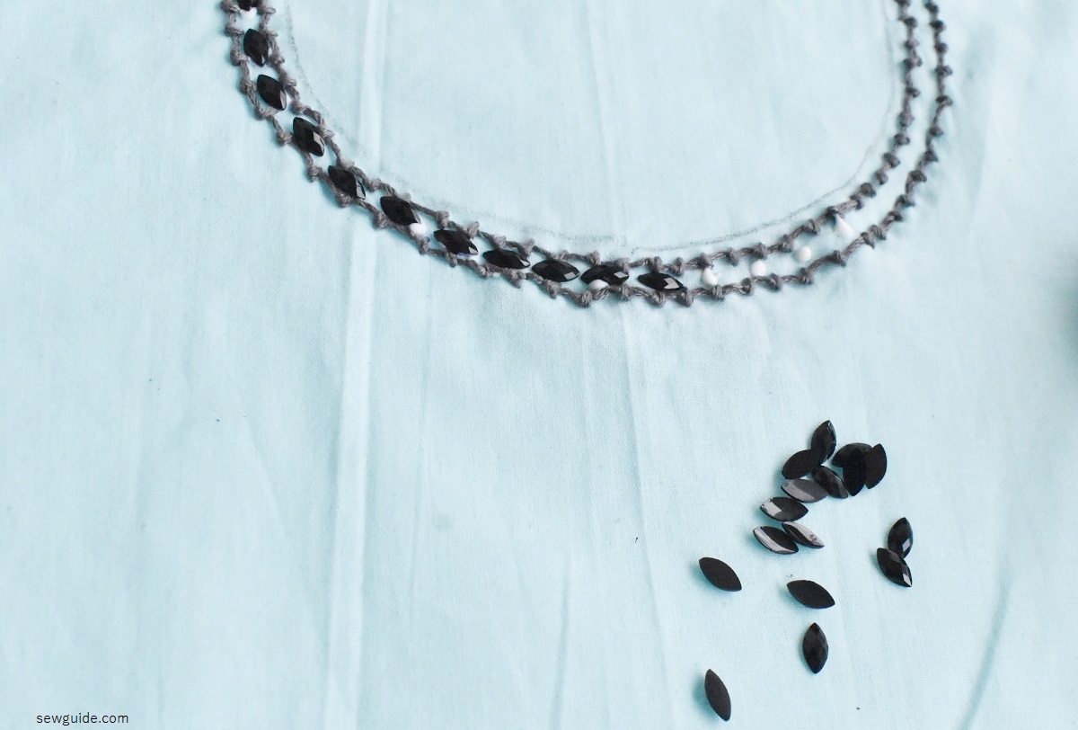 The most simple & easy neckline embroidery design is to make outline stitches like stem stitch, or chain stitch along the neckline in a single layer or double layer and then add some beads to it.