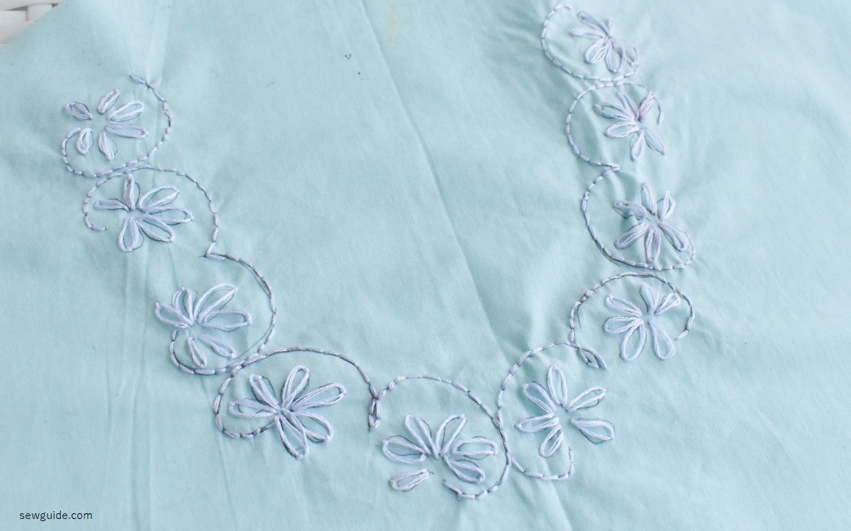 Another simple embroidery design idea is to use lazy daisy stitches along the neckline.