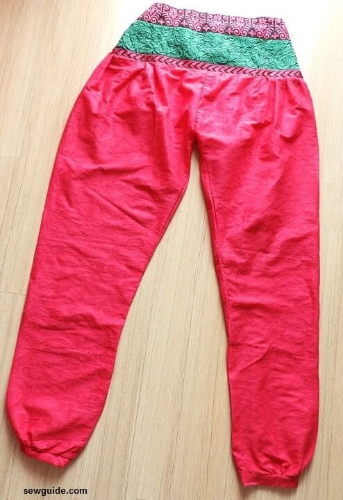 Make a casing for elastic at the pant hem also the same way. Do the same as before for an elastic casing . Checkout this tutorial to sew a separate waistband.