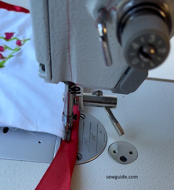 At the end, when you reach where you started, over lap the ribbon, fold the edge and stitch in place.