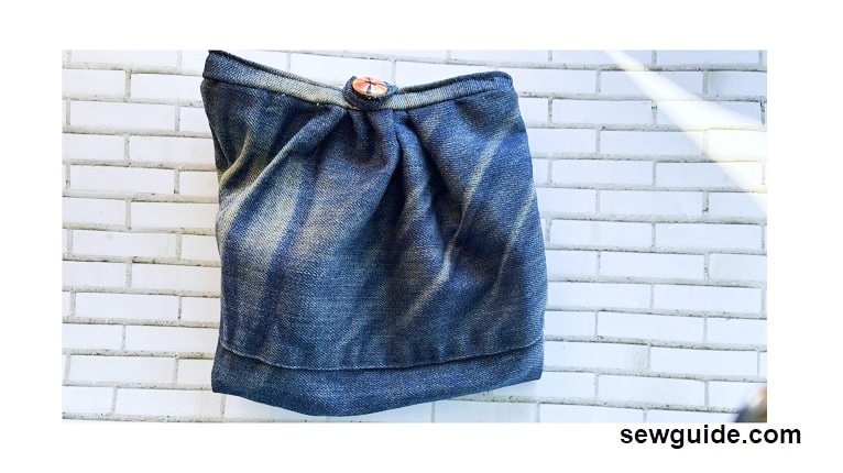 Turn the band to the inside and hand sew in place. You can machine stitch as well. Attach a button in the center of the front of your denim pouch.