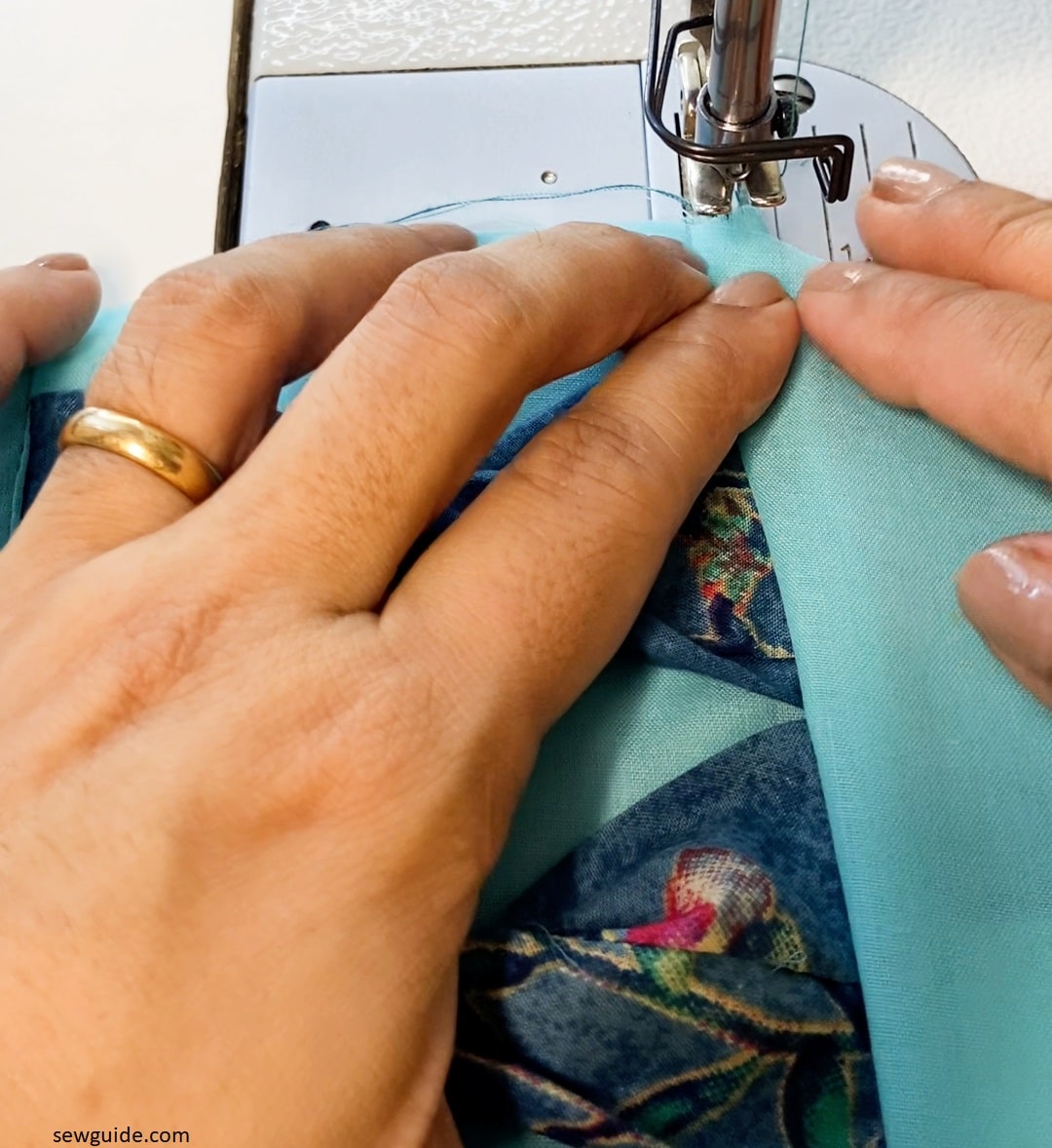 Fold the sleeve fabric on top of the bow fabric edge – effectively covering the edges of the bow fabric. Top Stitch in place