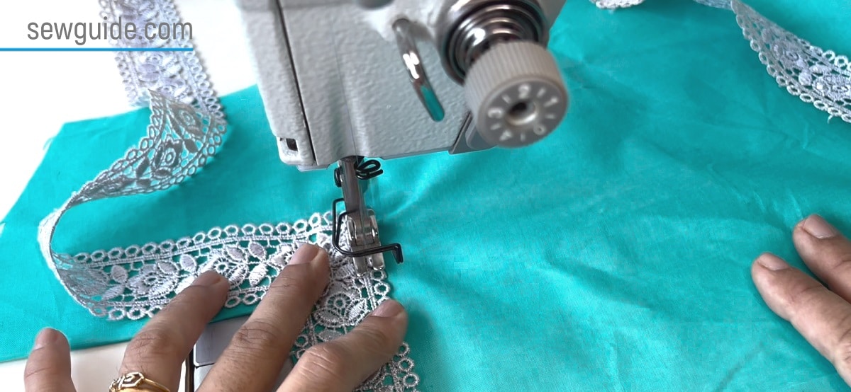 Place the lace trim on top and sew it in place, folding it as shown in the pictures below.