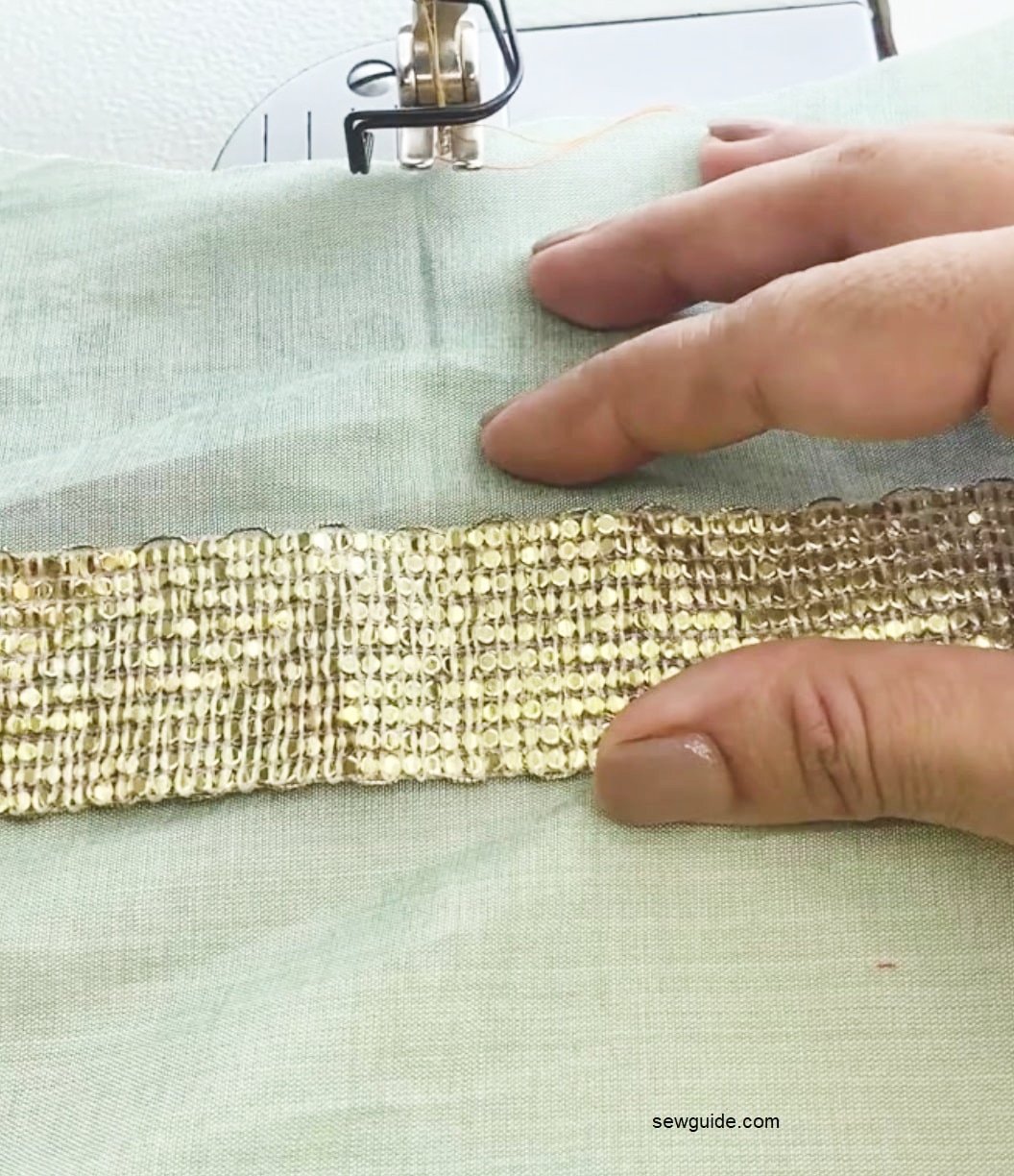 Pin the trim in place so it stays aligned as you sew.