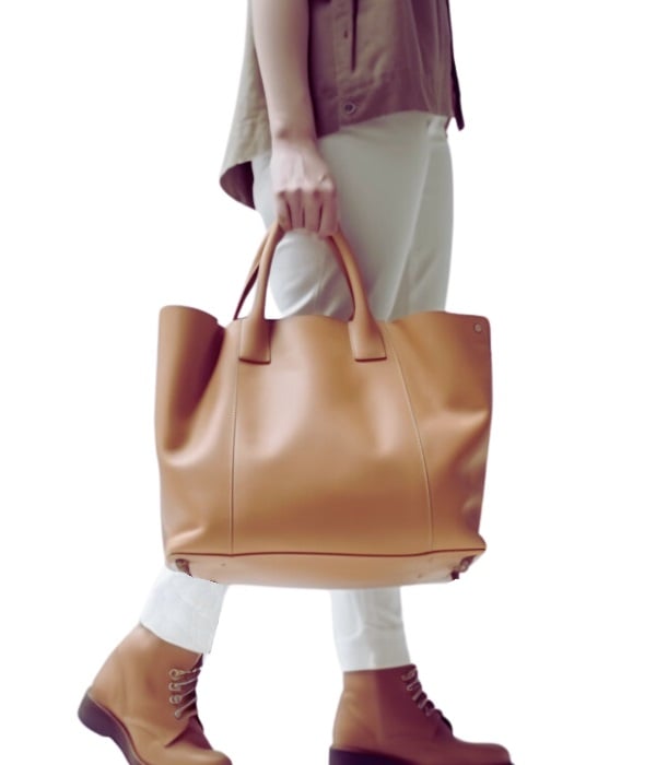 Classic accessories: Leather belts, simple stud earrings, a classic watch, and a versatile leather handbag or high-quality backpack in organic canvas material.