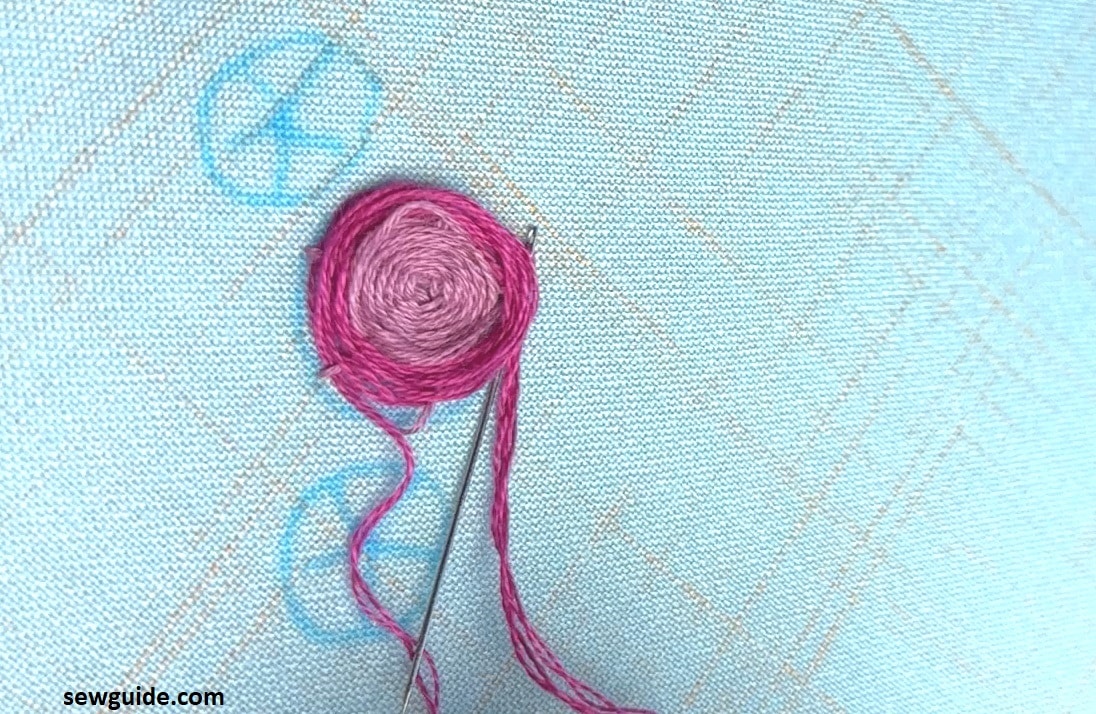 Continue alternating between going over and under the spokes, till you reach the outer edge of the straight stitches and you run out of space on the spokes. When the rose shape has formed, bring the needle down and tie a knot to finish.