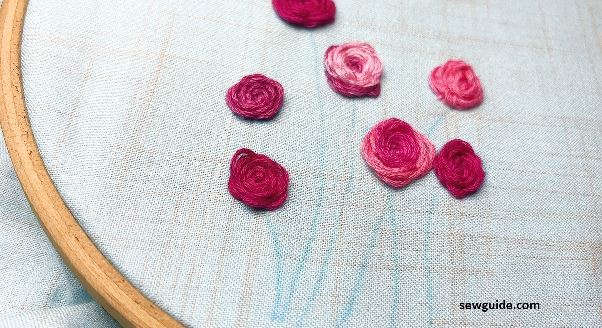 Infact, just like texture, the number of thread you use to make them can also change the look of your roses. This is a rose being done with two strands of embroidery floss.