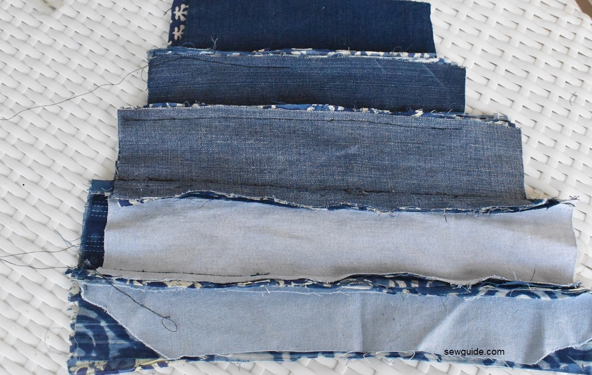 Cut them into strips or use as is in one piece, If you do not want the fraying in the joints. Sew them together -here the seam is joined by keeping the fabric layers, wrong sides together. The seam edge should appear to the front of the fabric.