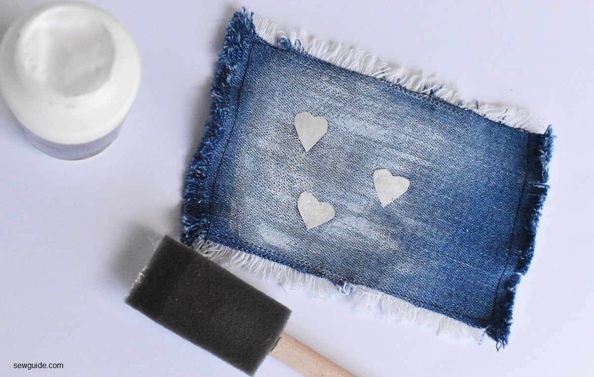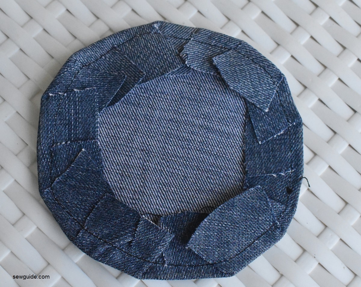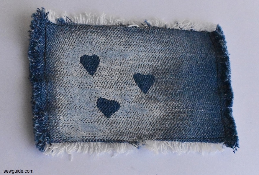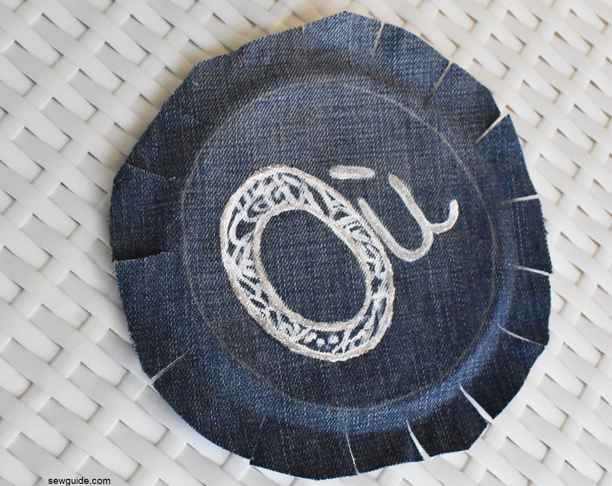 Cut out denim fabric scrap piece from your old jeans. Sew 1/4 or 1/2 inch from the outer edge, all along the edge.